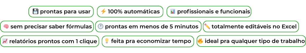 Mas eu sei que você não quer mais passar por isso. Já passou da hora de ter planilhas prontas, automáticas e profissionais que funcionam de verdade, sem erro e sem precisar entender de fórmula.